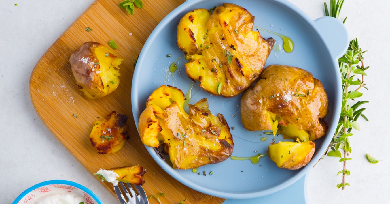 Smashed Potatoes nach Wunsch mit Kresse und Sauerrahm zu Gegrilltem servieren.