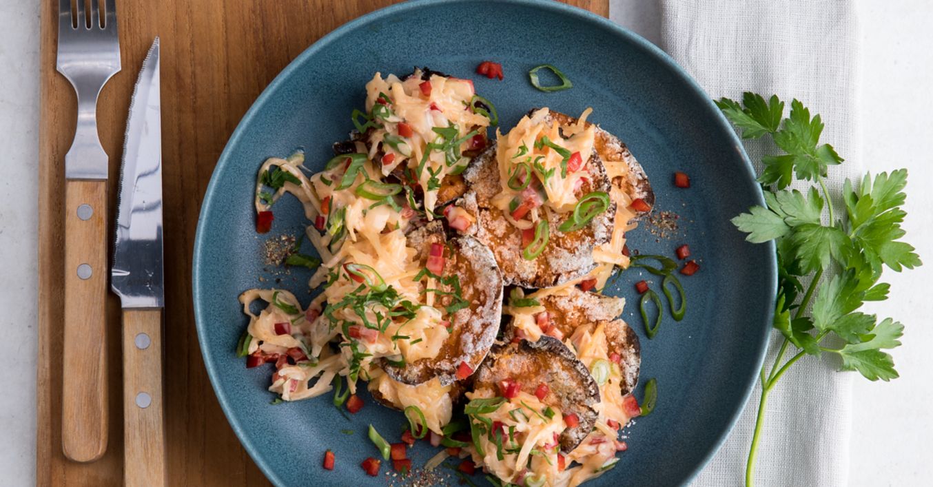 Smashed Süßkartoffelsalat mit Paprika und Kraut
