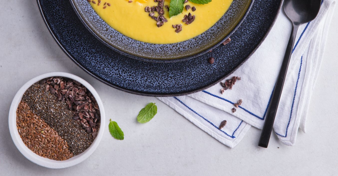 Die übrige Banane schälen und in dünne Scheiben schneiden. Smoothiebowl mit den Mangowürfeln, den Bananenscheiben, den Chiasamen, der Leinsaat und den Kakaonibs garnieren. Mit einigen Minzblättern bestreuen.