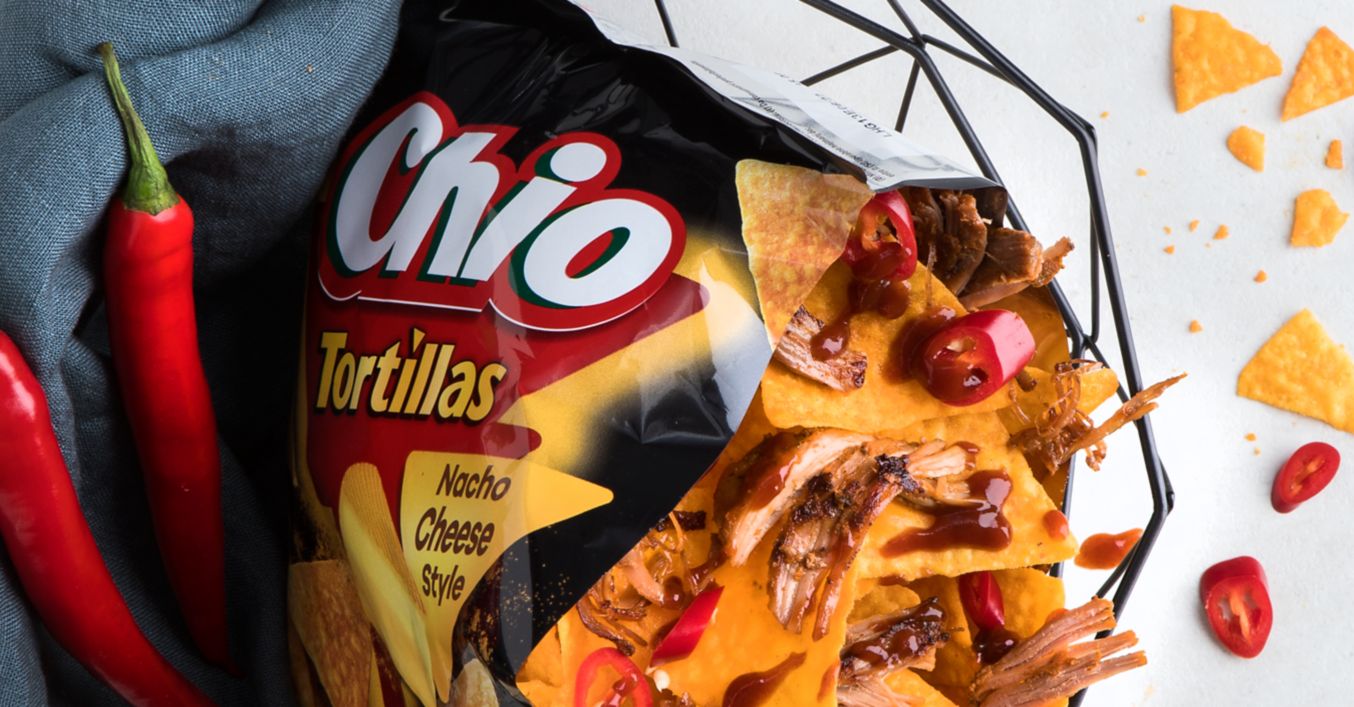Tortilla-Tüte seitlich mit einer Schere aufschneiden. Fleischstücke, Chiliringe und BBQ-Sauce über die Tortilla-Chips geben, schwenkend schütteln und genießen.