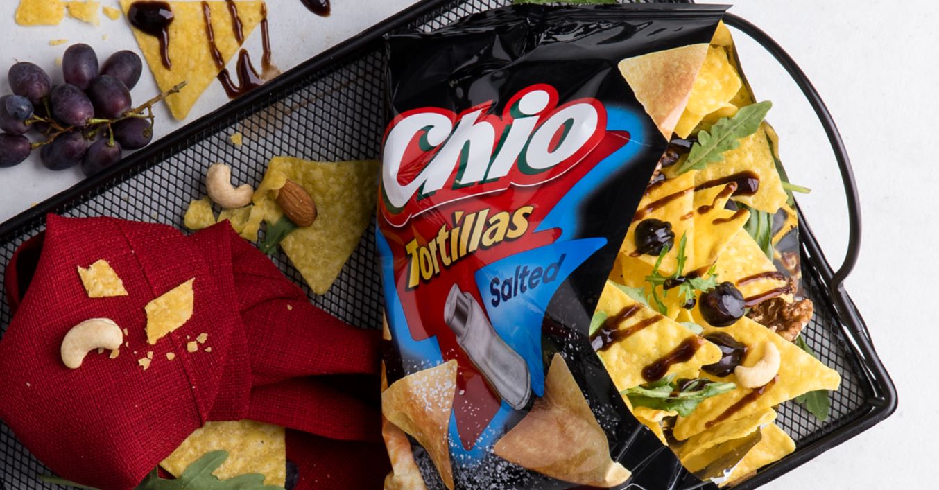 Trauben halbieren und mit Rucola, Nüssen und Balsamicocreme über die Tortilla-Chips geben, schwenkend schütteln und servieren.