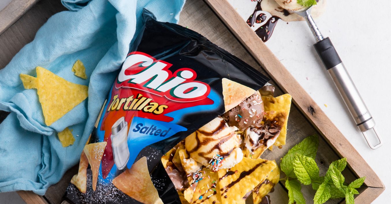 Eiskugeln, Schoko-, Karamellsoße über die Tortilla-Chips geben, schwenkend schütteln und mit Zuckerstreuseln bestreut servieren.