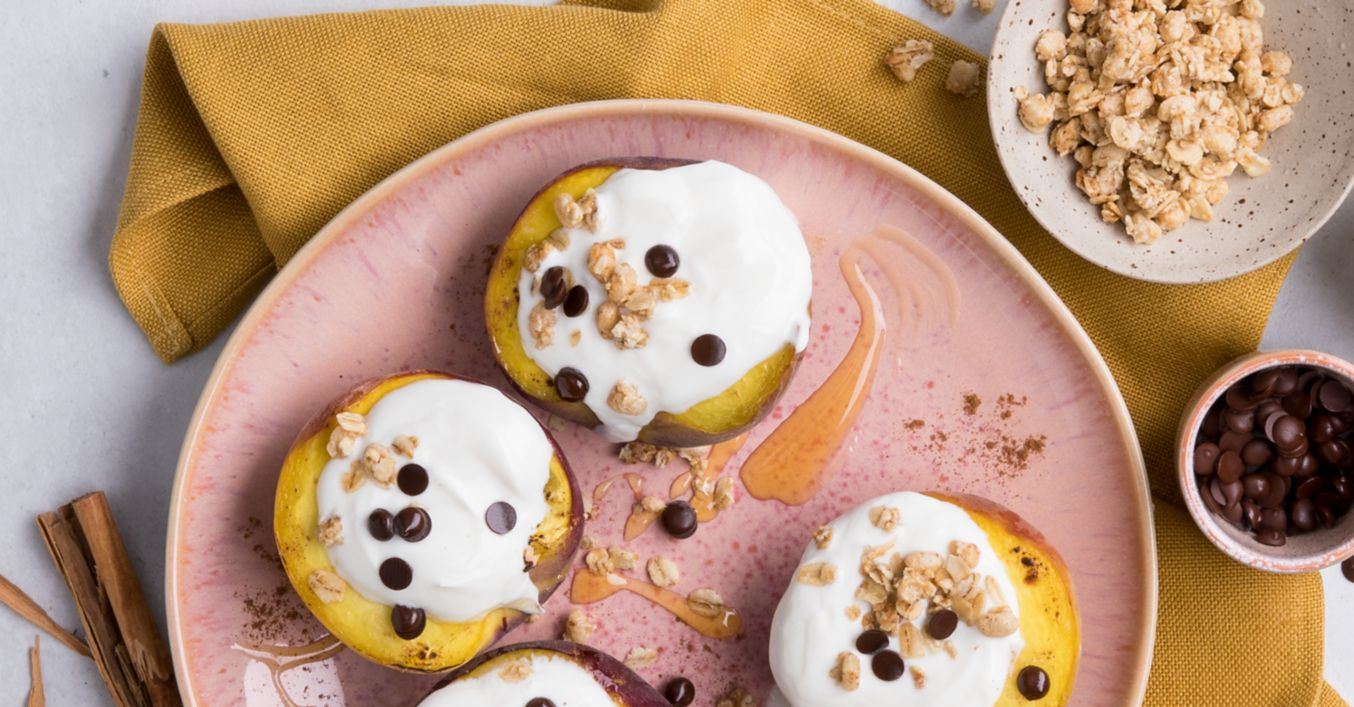 Die gebackenen Pfirsiche zum Schluss mit Joghurt und dem Topping der Wahl garnieren und genießen.