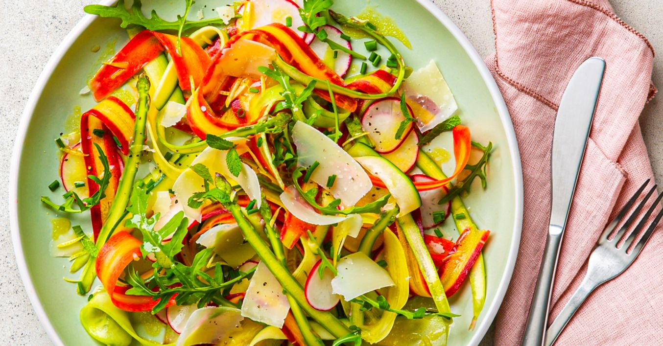 Gurke und Möhren schälen und mit Zucchini, Spargel und Rettich mit einem Sparschäler in lange Streifen schälen.