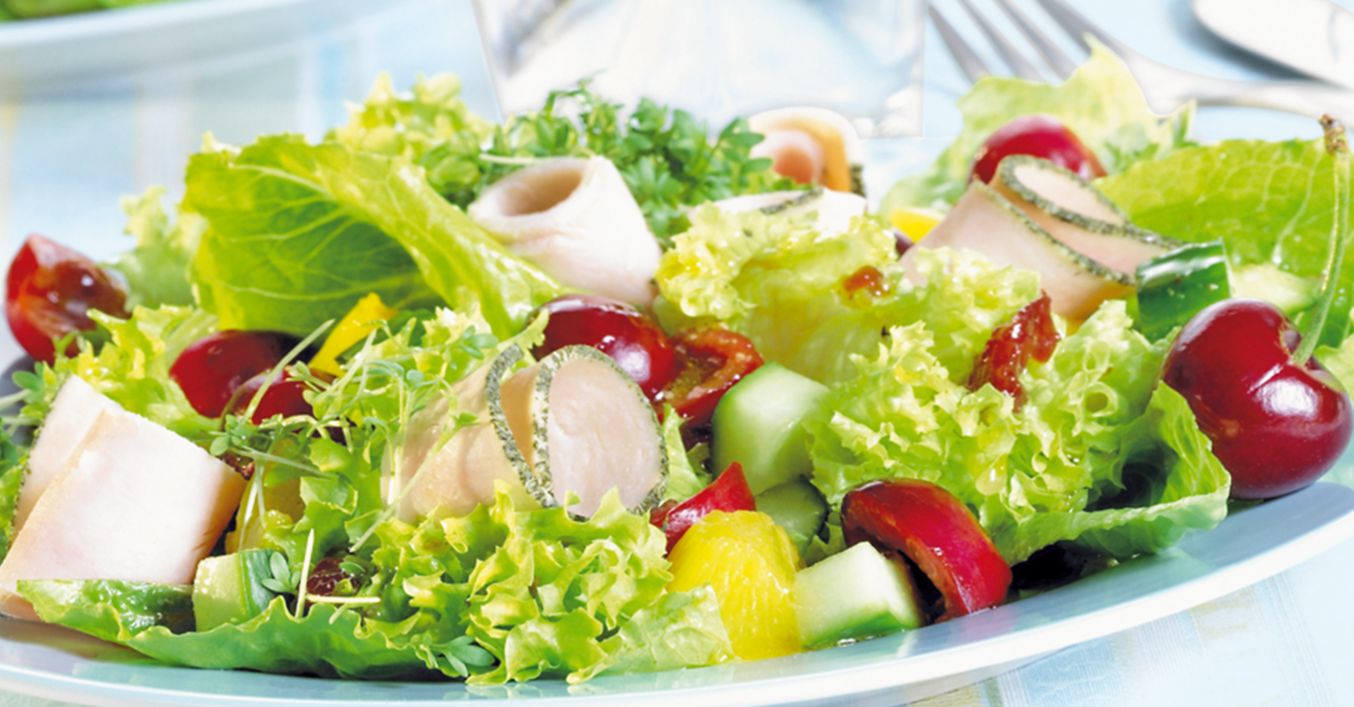Für den Salat Friséesalat und Lollo Bianco putzen, waschen und in mundgerechte Stücke zupfen. Gurke halbieren, die Kerne mit einem Löffel heraus kratzen und in Würfel schneiden. Mango schälen, Kern entfernen und Fruchtfleisch in Würfel schneiden. Kirschen waschen, halbieren und entsteinen, Putenbrustaufschnitt aufrollen.