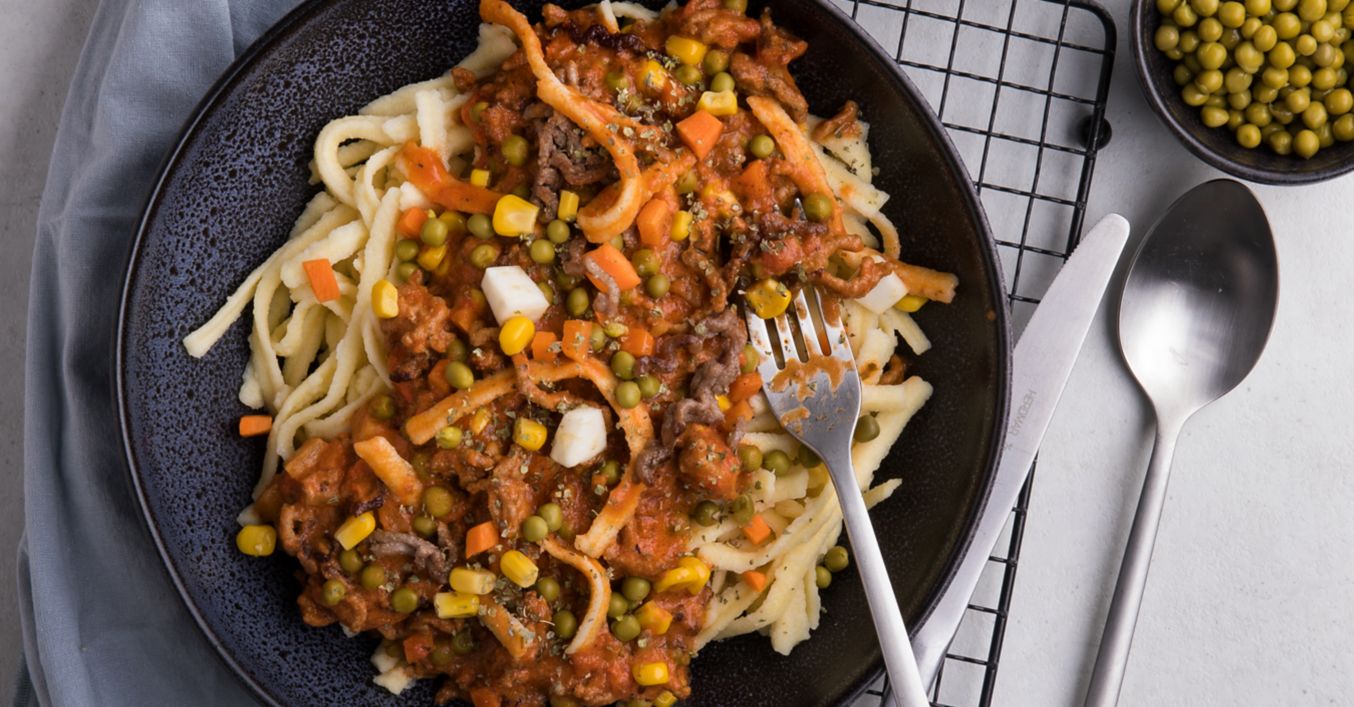 Spätzle mit Erbsen-Mais-Bolognese