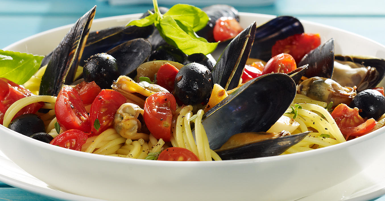 Spaghetti mit Muscheln und Tomaten-Oliven Sugo