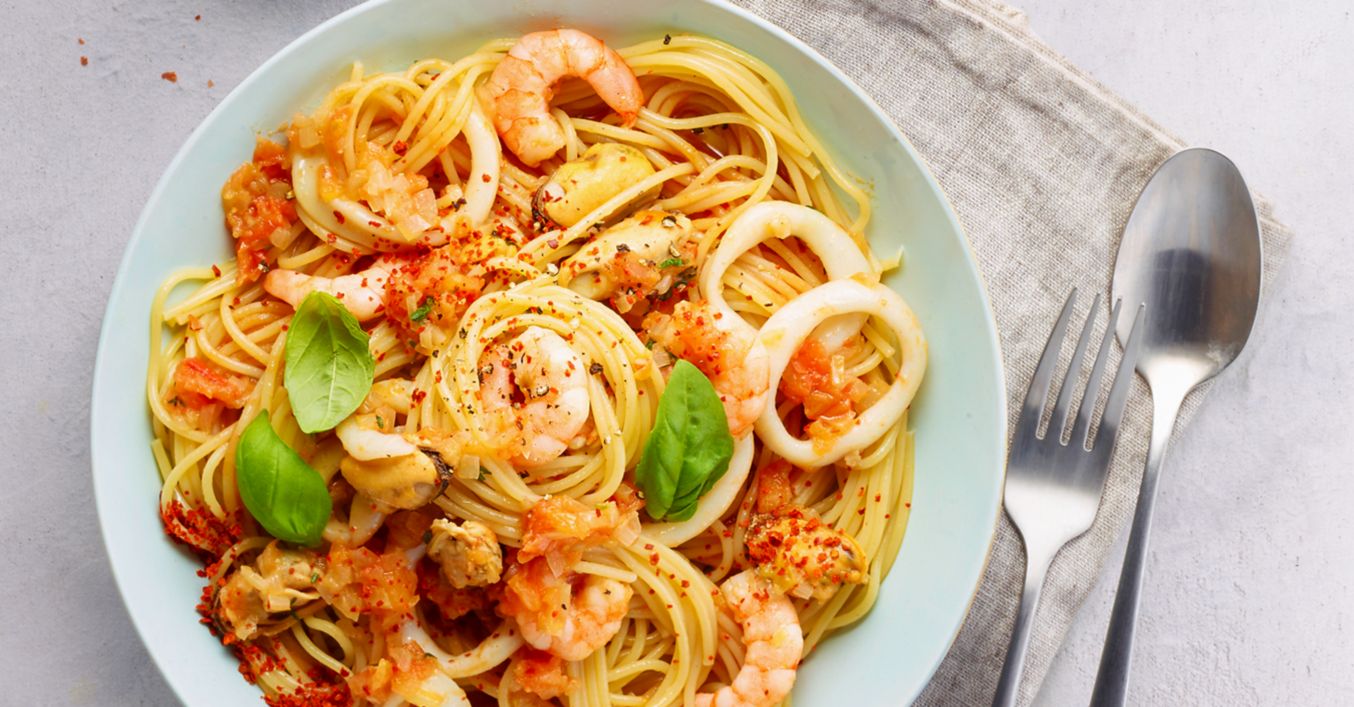 Zwiebel und Knoblauchzehen abziehen, Zwiebel in feine Würfel schneiden, Knoblauch zerdrücken. Beides in einem Topf in heißem Olivenöl glasig dünsten, Meeresfrüchte dazu geben und kräftig anbraten. Tomatenwürfel zufügen, Gemüsebrühe und Weißwein angießen und ca. 5 Minuten dünsten. Tomatenmark einrühren und etwas einkochen lassen.