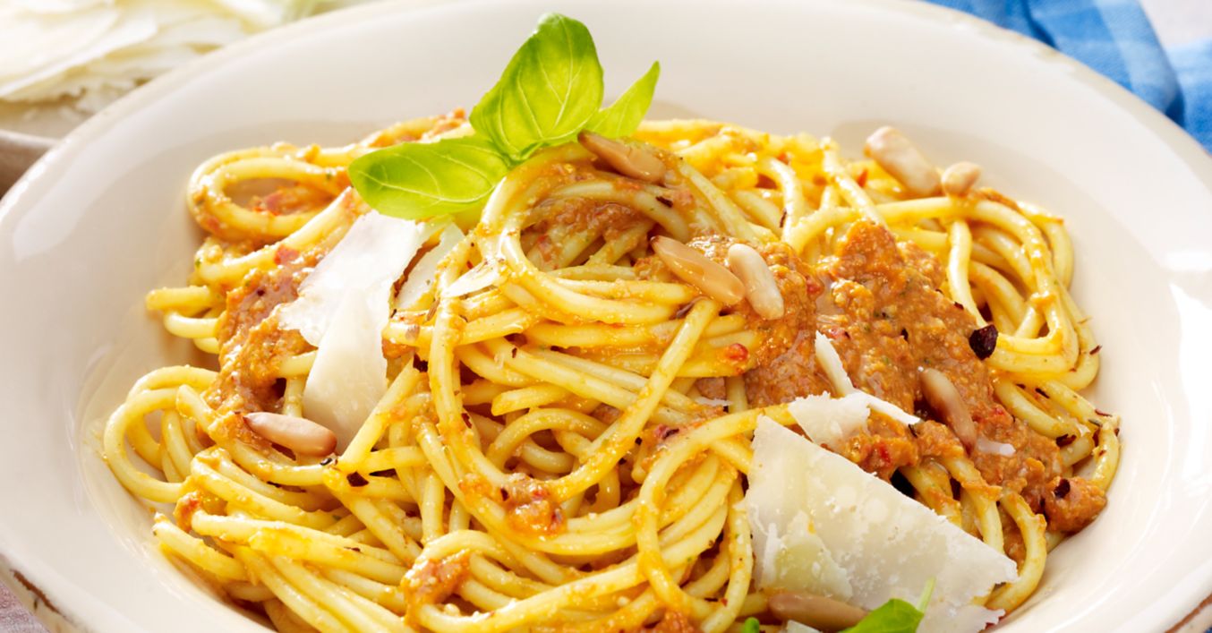 Spaghetti in kochendem Salzwasser circa 8 bis 10 Minuten garen, mit Pesto vermischen und auf Teller anrichten. Mit Basilikum und nach Wunsch mit frischen Parmesanhobeln und gerösteten Pinienkernen garniert servieren.