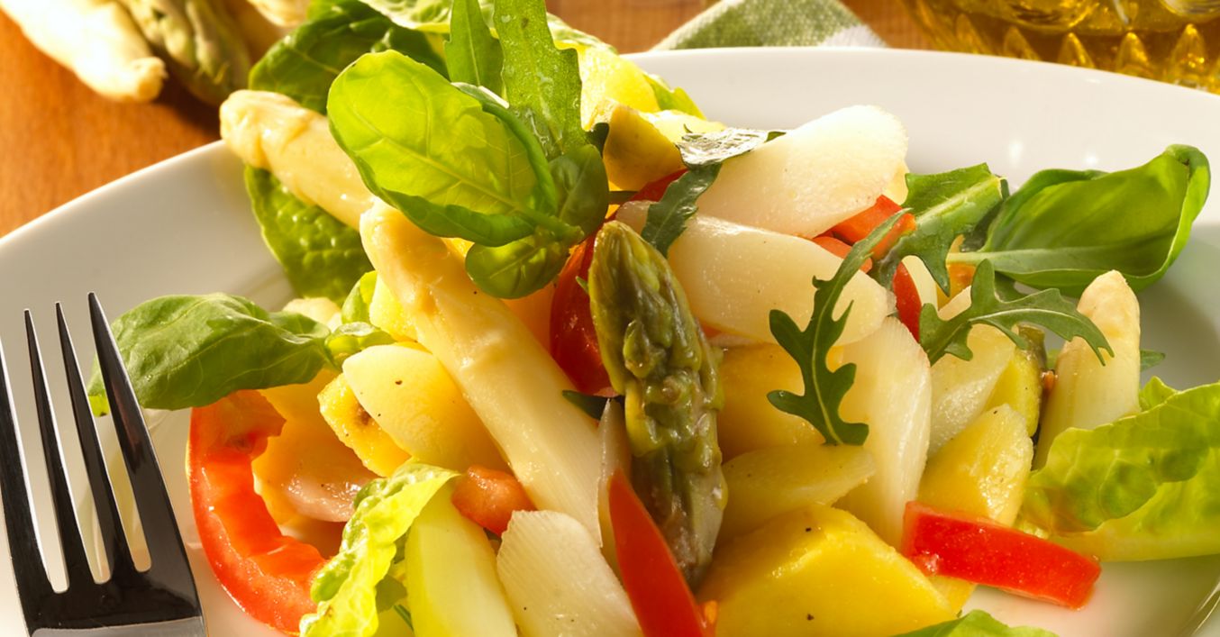 Salatherzen, Tomaten und Rucola putzen, waschen. Salat in mundgerechte Stücke zupfen, Tomaten entkernen und in Streifen schneiden. Basilikumblätter abzupfen, waschen und trocken tupfen. Für das Dressing Olivenöl mit Essig, Spargelfond, Salz, Zucker und Pfeffer verrühren und über die Kartoffeln geben. Spargelstücke hinzufügen, vorsichtig vermengen und ca. 20 Minuten ziehen lassen. Salat und die Tomaten unterheben, nochmals mit Salz und Pfeffer würzen und mit Basilikum servieren.