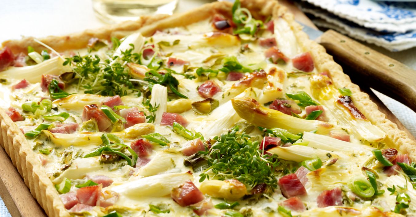 Restliche Eier, Quark, Schmand und Kräuter verquirlen und mit Salz und Pfeffer würzen. Spargel, Schinken und Frühlingszwiebeln mit dem Guss vermischen.