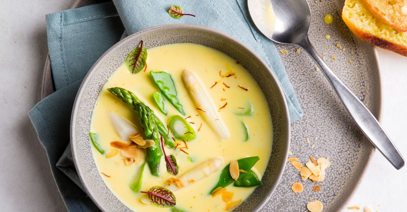 Butter in einem Topf schmelzen lassen, Mehl zugeben und glatt rühren. Mehlschwitze mit Spargelwasser, Wein und Sahne ablöschen, aufkochen, mit Salz, Pfeffer und Zucker abschmecken und mit Safran verfeinern.