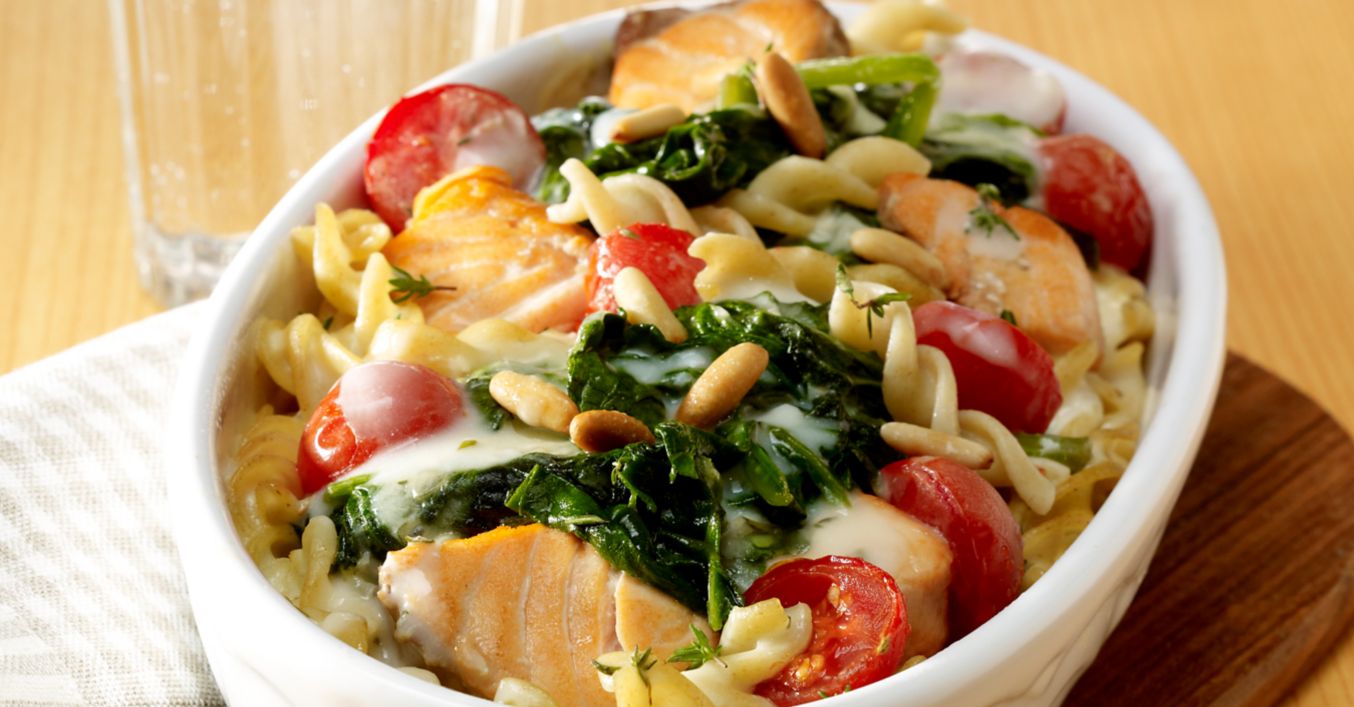 Lachsstücke in erhitztem Öl anbraten, herausnehmen und in eine Auflaufform (circa 28 mal 32 Zentimeter) oder Portionsförmchen legen. Nudeln auf dem Lachs verteilen. Spinat mit 1 Teelöffel Butter und Schalotten in das verbliebene Bratfett geben, circa 5 Minuten dünsten, mit Salz, Pfeffer und Muskat würzen und mit Tomaten auf die Nudeln geben.