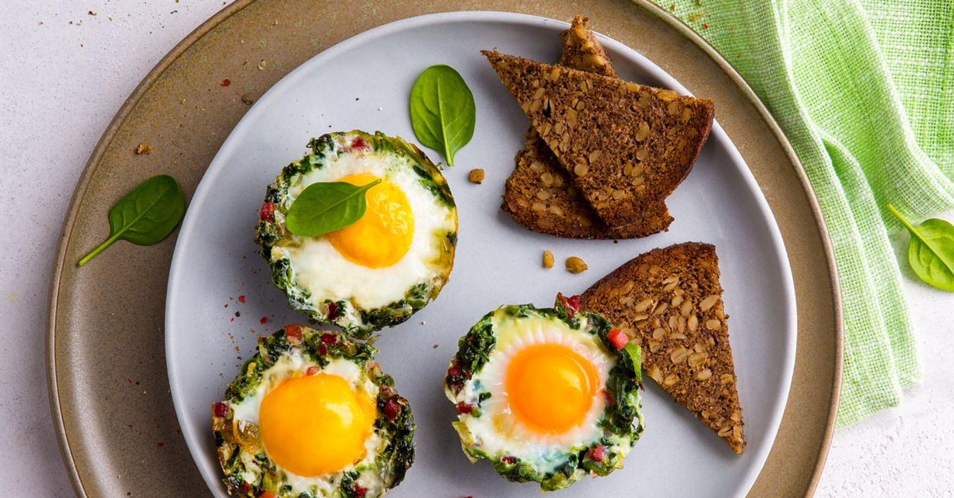 Eier aufschlagen und jeweils 1 Ei in die Mitte einer Mulde geben. Mit etwas Salz und Pfeffer würzen und im vorgeheizten Backofen bei 180 Grad (Gas: Stufe 3, Umluft: 160 Grad) circa 15 bis 20 Minuten garen. Brot in Streifen schneiden, mit in den Backofen geben und 5 Minuten knusprig backen. Spinatnester mit den Brotstreifen auf Teller anrichten und servieren.