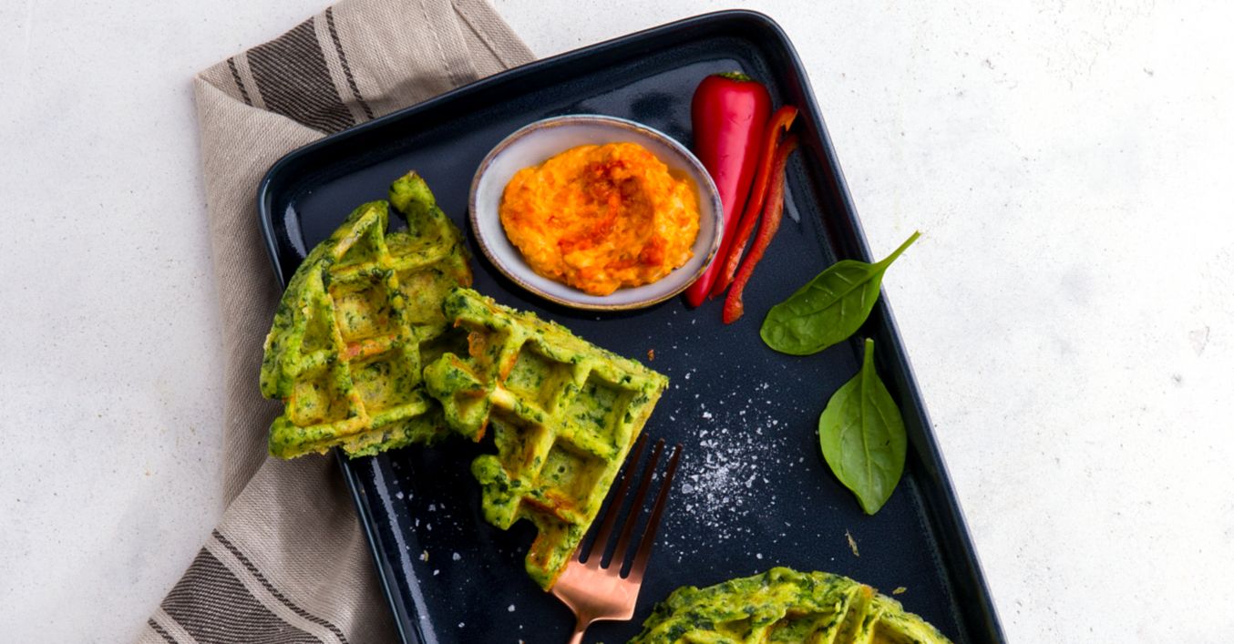 In einem leicht gefetteten Waffeleisen nacheinander 8 Waffeln ausbacken. Frischkäse und Ajvar verrühren, mit Salz und Pfeffer abschmecken und zu den Waffeln servieren.