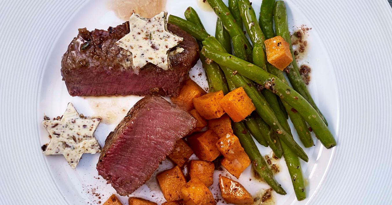 Steaks mit Buttersternen und Süßkartoffel-Zimt-Würfeln
