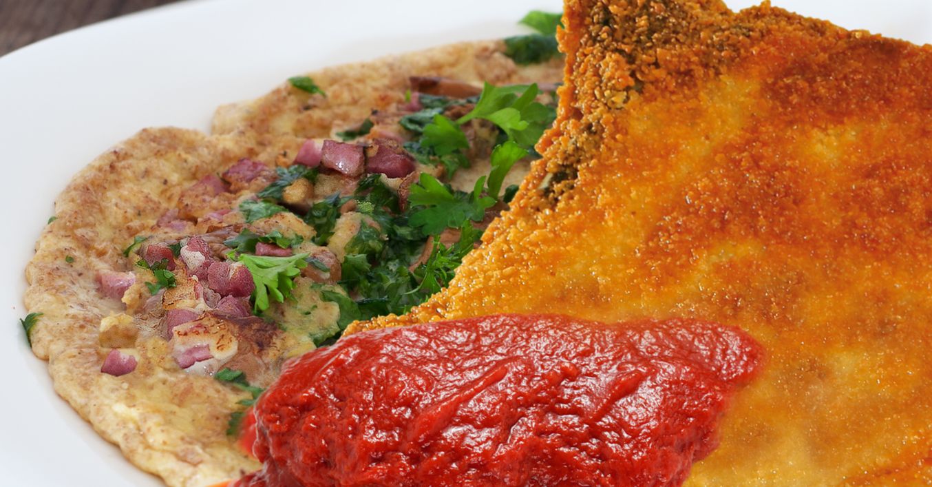 Anschließend die Tomaten salzen und alles langsam einreduzieren. Fleisch panieren, das heißt: Vorsichtig mit etwas Mehl bestäuben, in den 2 verschlagenen Eiern wälzen und leicht mit Paniermehl beklopfen. Alles zusammen in die heiße Butterpfanne geben und das Fleisch bei niedriger Temperatur leicht anbräunen lassen. Danach die Tomatensoße über das Kotelett gießen. In einer weiteren hitzebeständigen Pfanne Öl erhitzen und Speckwürfel scharf anbraten.
