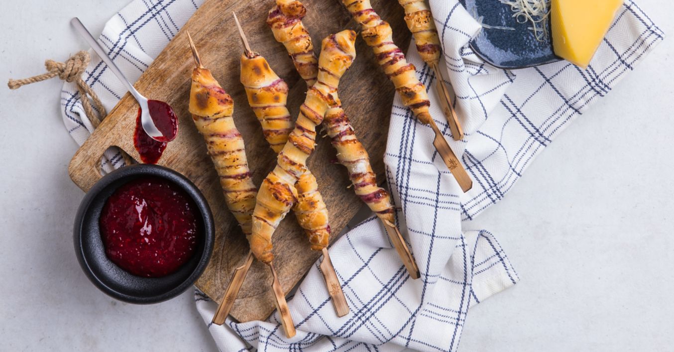 Je einen Streifen mit der Brombeer-Käse-Seite nach unten spiralförmig um einen 30 Zentimeter langen Stock wickeln, dafür an der Stockspitze anfangen und den Teig um den Stock legen. Den Teig am Ende leicht zusammendrücken.