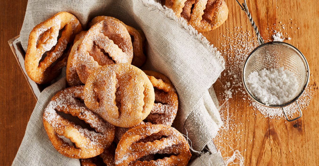 Pflanzenfett in einem Topf erhitzen. Mit dem Stiel eines Kochlöffels jeden zweiten Streifen im Teigkreis aufnehmen, in das heiße Pflanzenfett tauchen und 5 bis 10 Sekunden frittieren. Kochlöffel herausziehen und goldgelb fertig frittieren. Mit den restlichen Teigkreisen genauso verfahren.