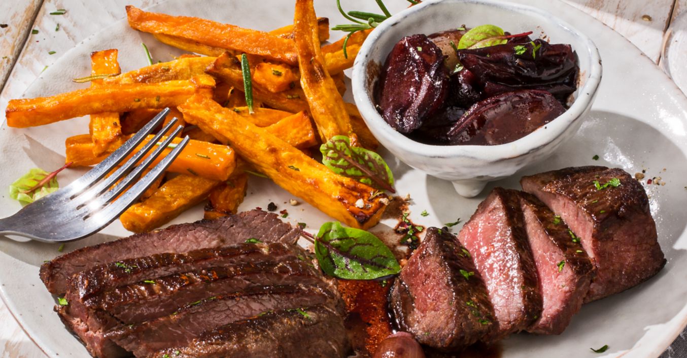 Straußensteak mit Rosmarin-Süßkartoffel-Pommes