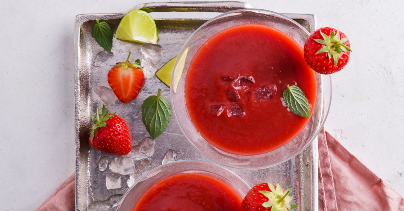 Daiquiri in Kelchgläser geben und mit Minze und nach Wunsch mit Erdbeeren garniert servieren.