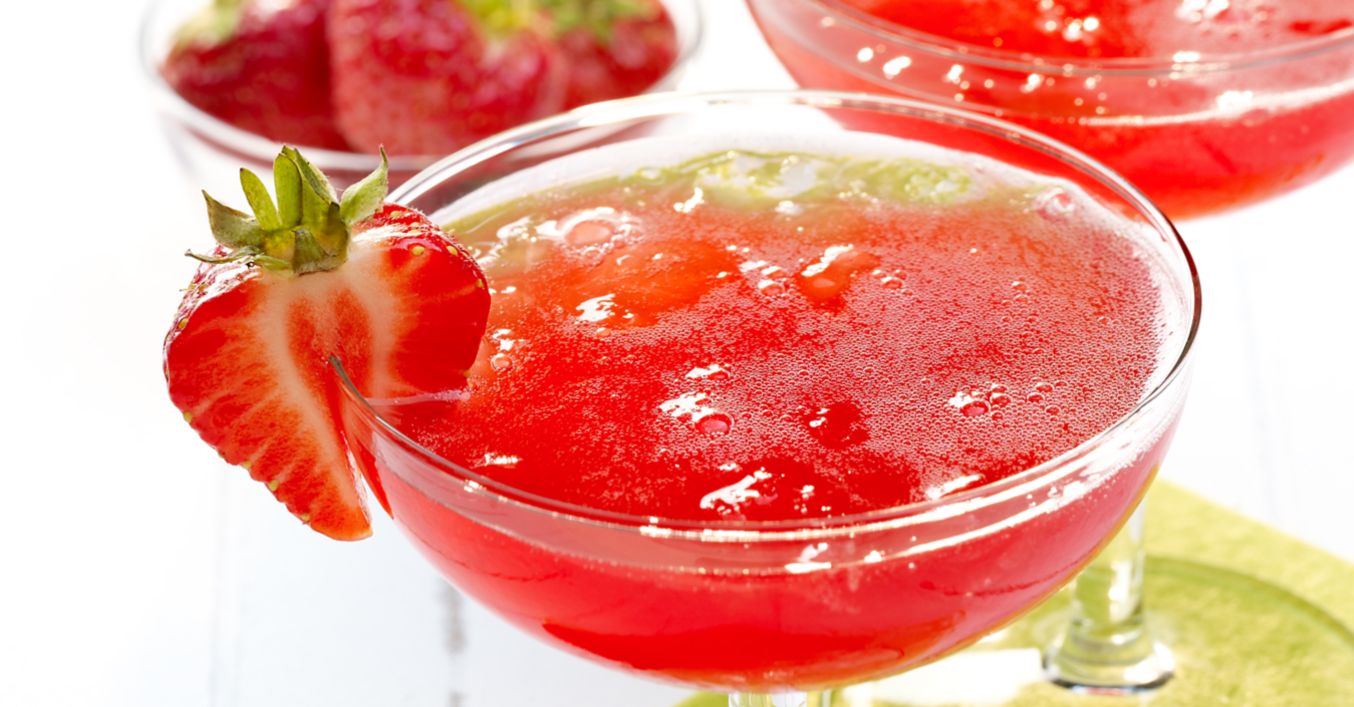 Mit Mineralwasser aufgießen. Die Gläser mit Erdbeeren dekorieren und mit langen Strohhalmen servieren. Unser Tipp: Die Gläser sehen auch sehr dekorativ aus, wenn Sie diese mit einem Zuckerrand verzieren