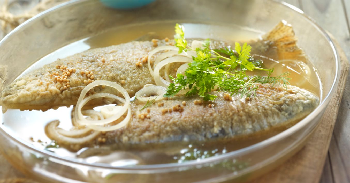Forellen in eine flache Schale legen, Sud darübergießen, kalt stellen und über Nacht durchziehen lassen.