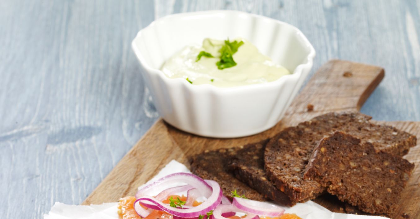 Avocado halbieren, den Kern und das Fruchtfleisch herauslösen und das Fruchtfleisch mit Zitronensaft beträufeln. Knoblauch abziehen, mit Öl, saurer Sahne und Avocado pürieren, Petersilie zufügen und den Dip mit Salz und Pfeffer abschmecken. Fischfilet dünn aufschneiden, mit Zwiebeln und Dip anrichten und mit Brot servieren.