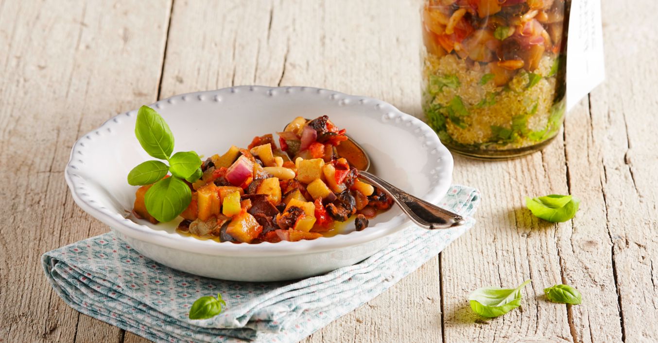 Den Quinoa in 2 große Einmachgläser füllen und darauf die Caponata verteilen. Die Gläser verschließen, mit einem schönen Etikett und einer Schleifen versehen und vor dem Genießen lauwarm erwärmen.
