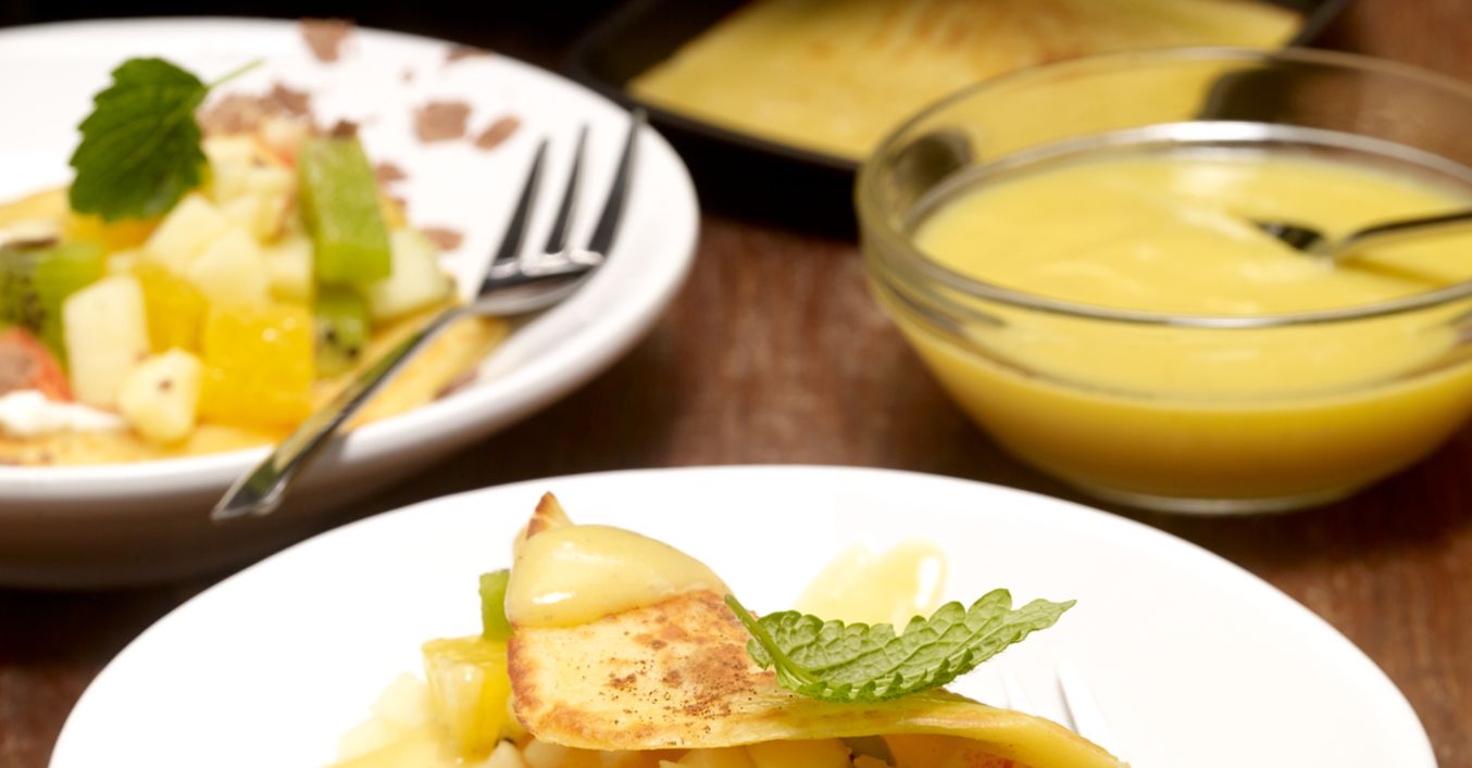 Crêpes je nach Wunsch mit Zimt-Zucker, Raspelschokolade, Frischkäse und Früchten füllen und mit Vanillesoße servieren.