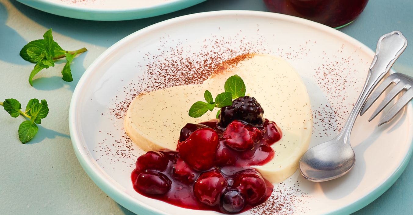 Herzen auf Teller stürzen und mit Beerengrütze und Tiefkühl-Beeren anrichten. Nach Wunsch mit Zitronenmelisse und Mangospalten garniert servieren.
