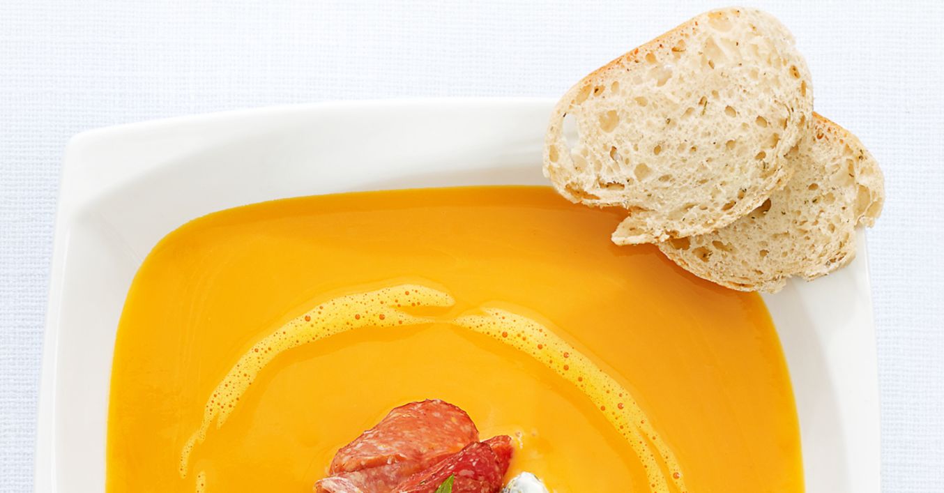 Suppe pürieren, mit Brotaufstrich verfeinern, mit Salz und Pfeffer abschmecken und in Tassen oder Teller füllen. Salami und Frühlingszwiebeln darüber streuen und mit Baguette servieren.