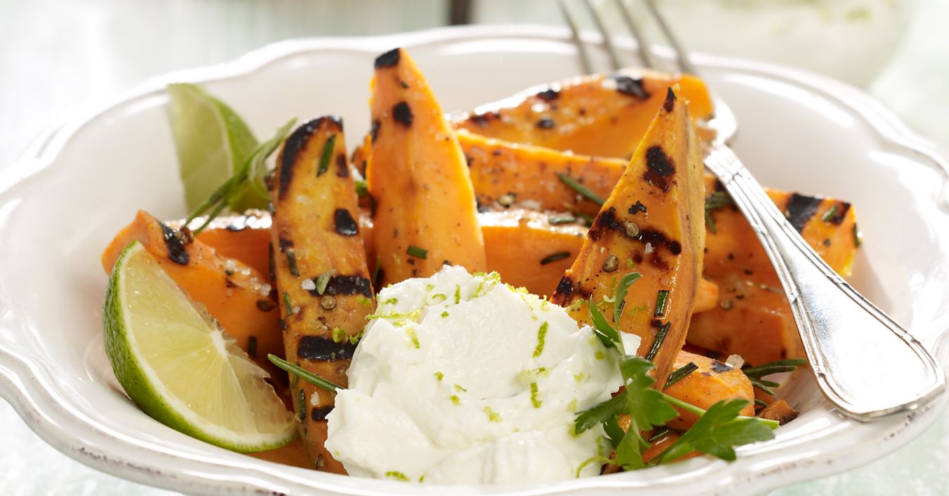 Süßkartoffel-Sticks mit dem Dip auf Teller anrichten und servieren.