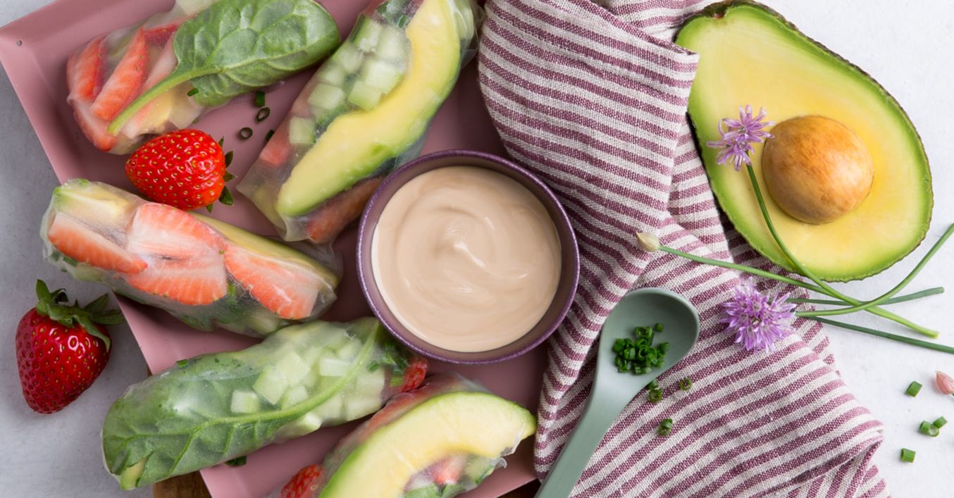 Etwa 1 Drittel vom Boden des Reisblatts entfernt, kann jetzt das Gemüse und die Erdbeeren (in Sticks geschnitten) platziert werden. Mit etwas Schnittlauch, Salz und Pfeffer würzen. Dann wird der Boden des Reispapiers zuerst eingeklappt, danach eine Seite darübergelegt und aufgerollt.