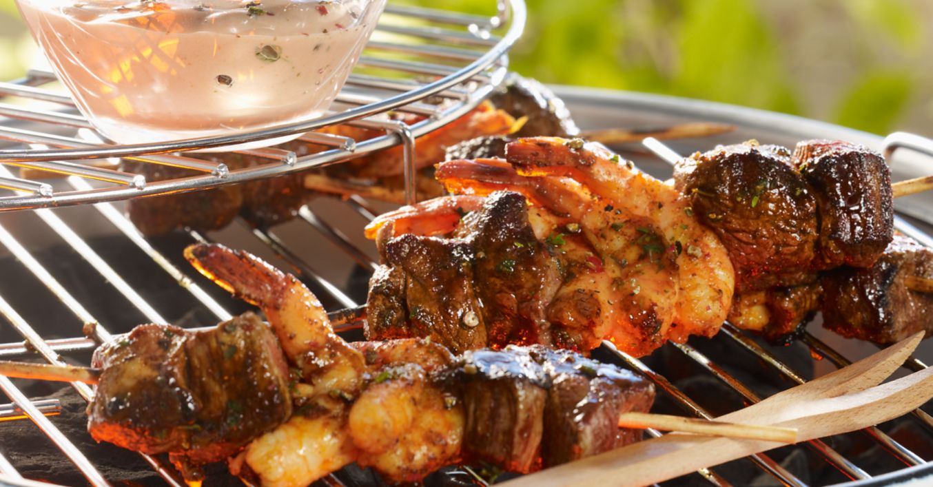 Spieße circa 5 Minuten auf dem Grill zubereiten, mit dem Dip und nach Wunsch mit frischem Baguette servieren.