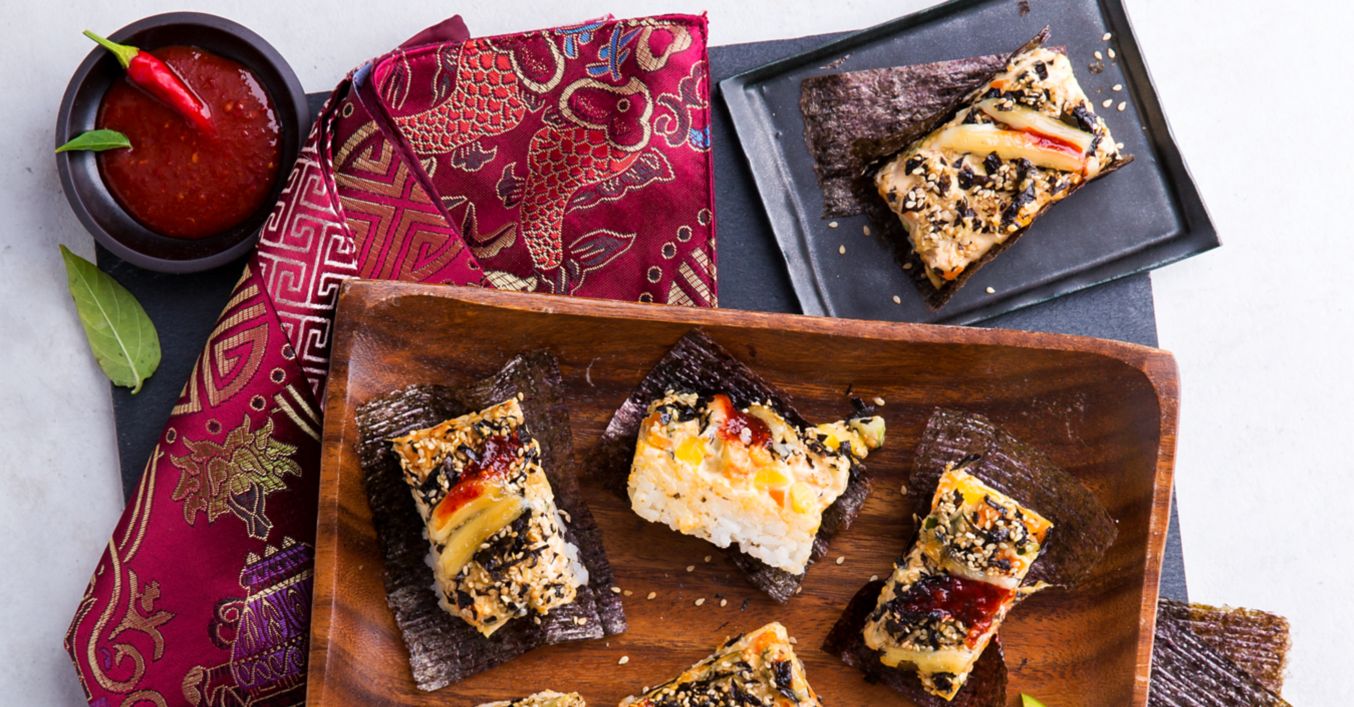 Fertige Sushi Bakes in Rechtecke schneiden und mit Nori-Blättern servieren.