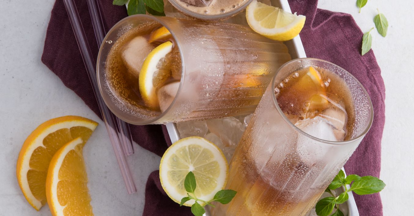 Gin, Rum, Tequila, Cointreau, Zitronen- und Orangensaft mit Eiswürfeln in ein großes Longdrinkglas geben.