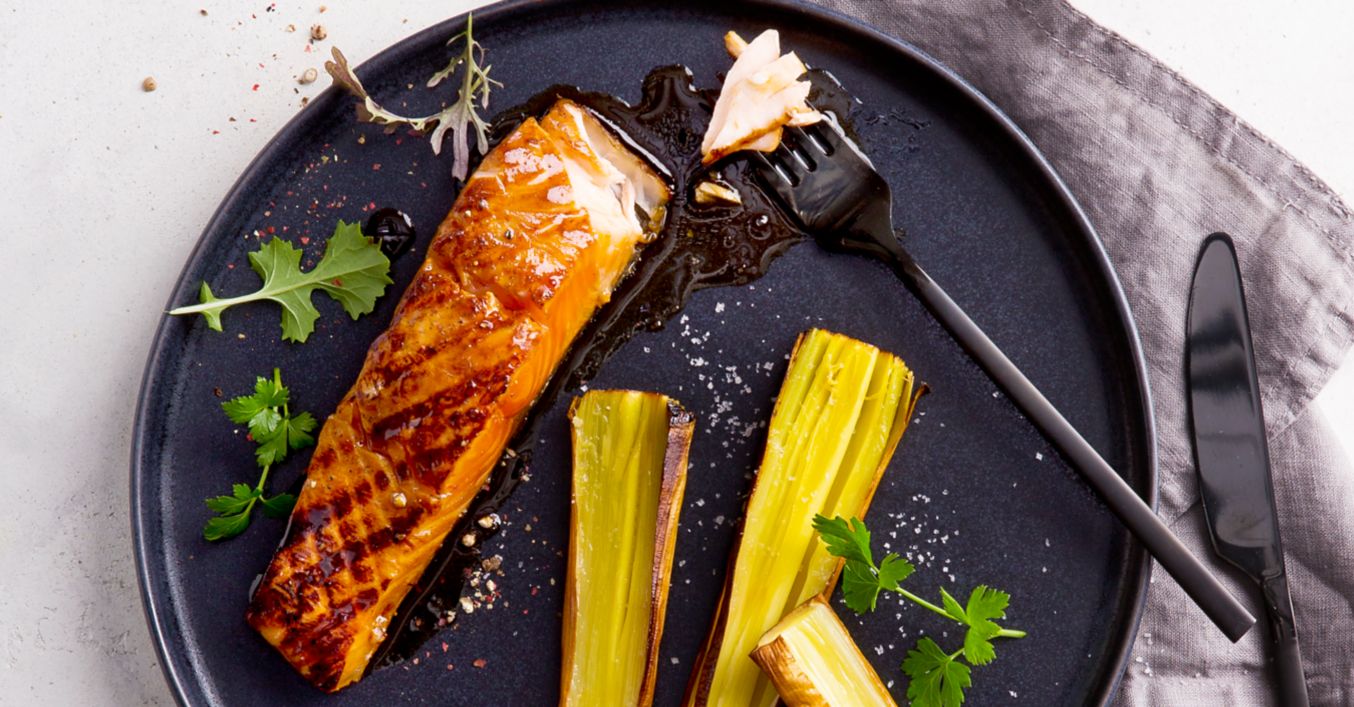 Teriyaki-Lachs mit in der Glut gegartem Lauch