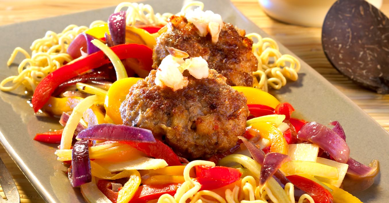 Eiernudeln nach Packungsanweisung zubereiten und zu den Thai-Frikadellen mit Gemüse servieren.