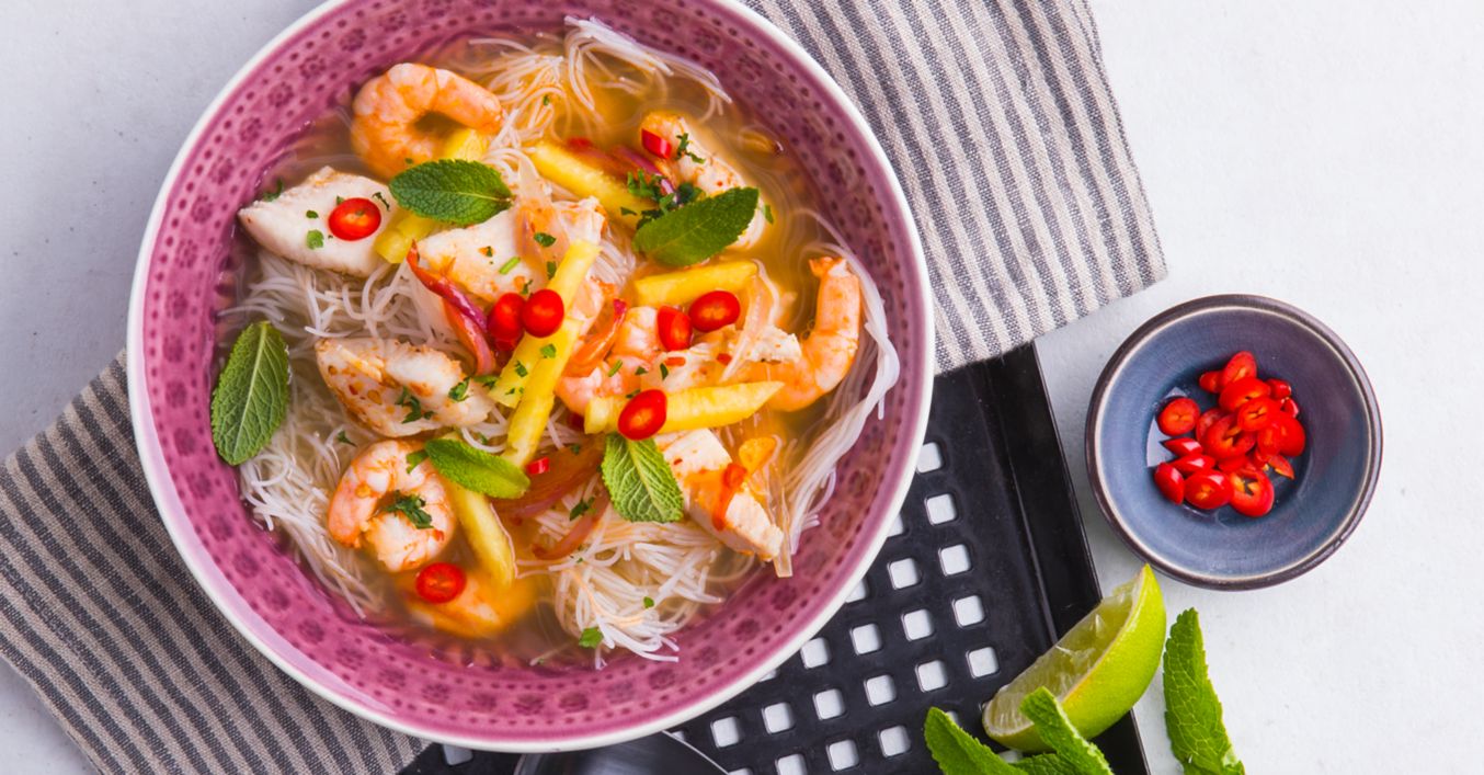Fischfilet, Garnelen und Reisnudeln in die Suppe geben und 4 bis 6 Minuten garen. Salz, Limettensaft und Chiliringe einrühren und die Suppe in 4 Schalen anrichten. Mit gehackter Petersilie, Ananas und einigen Minzeblättern bestreut servieren.