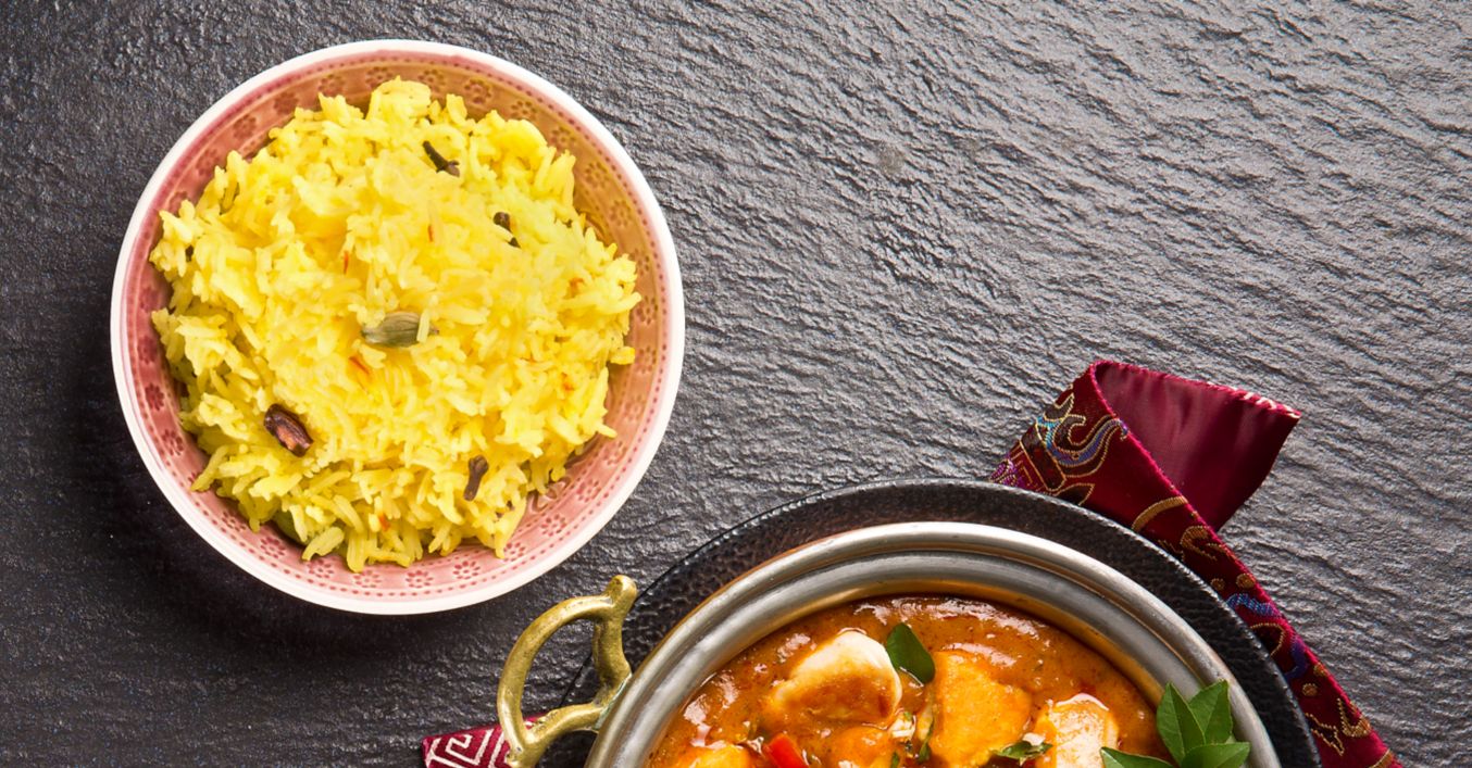 Tikka Masala anrichten, den Reis mit einer Gabel auflockern und dazu servieren.