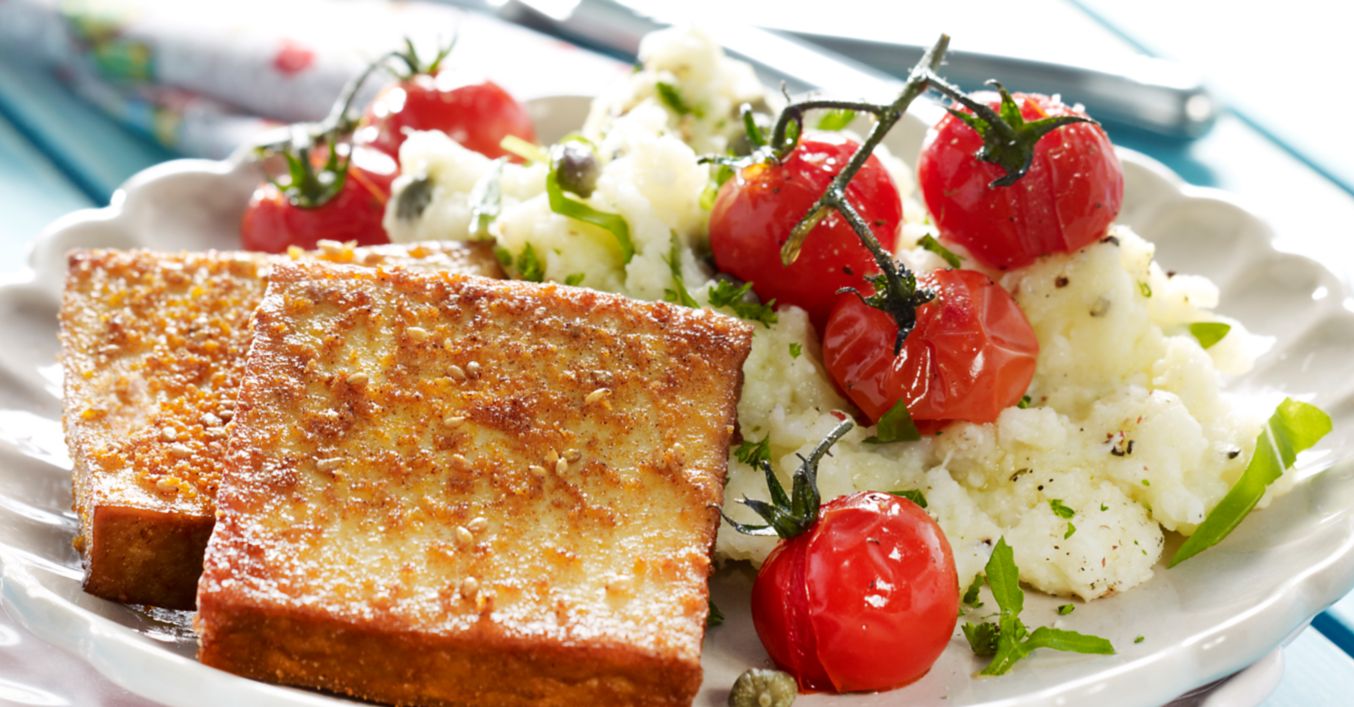 Tofu-Schnitzel mit würzigem Blumenkohl-Kartoffelstampf