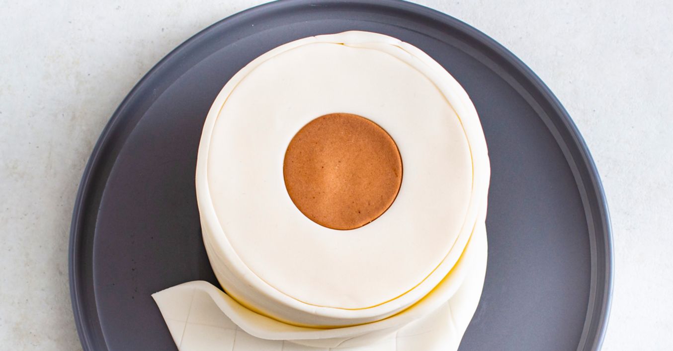 30 Gramm des Fondants mit etwas Backkakao beige-braun einfärben, ebenfalls 3 Millimeter dick ausrollen und einen kleinen Kreis (Durchmesser 5 Zentimeter) ausstechen. Dieser kleine Kreis wird in die Mitte des weißen Rings gesetzt.