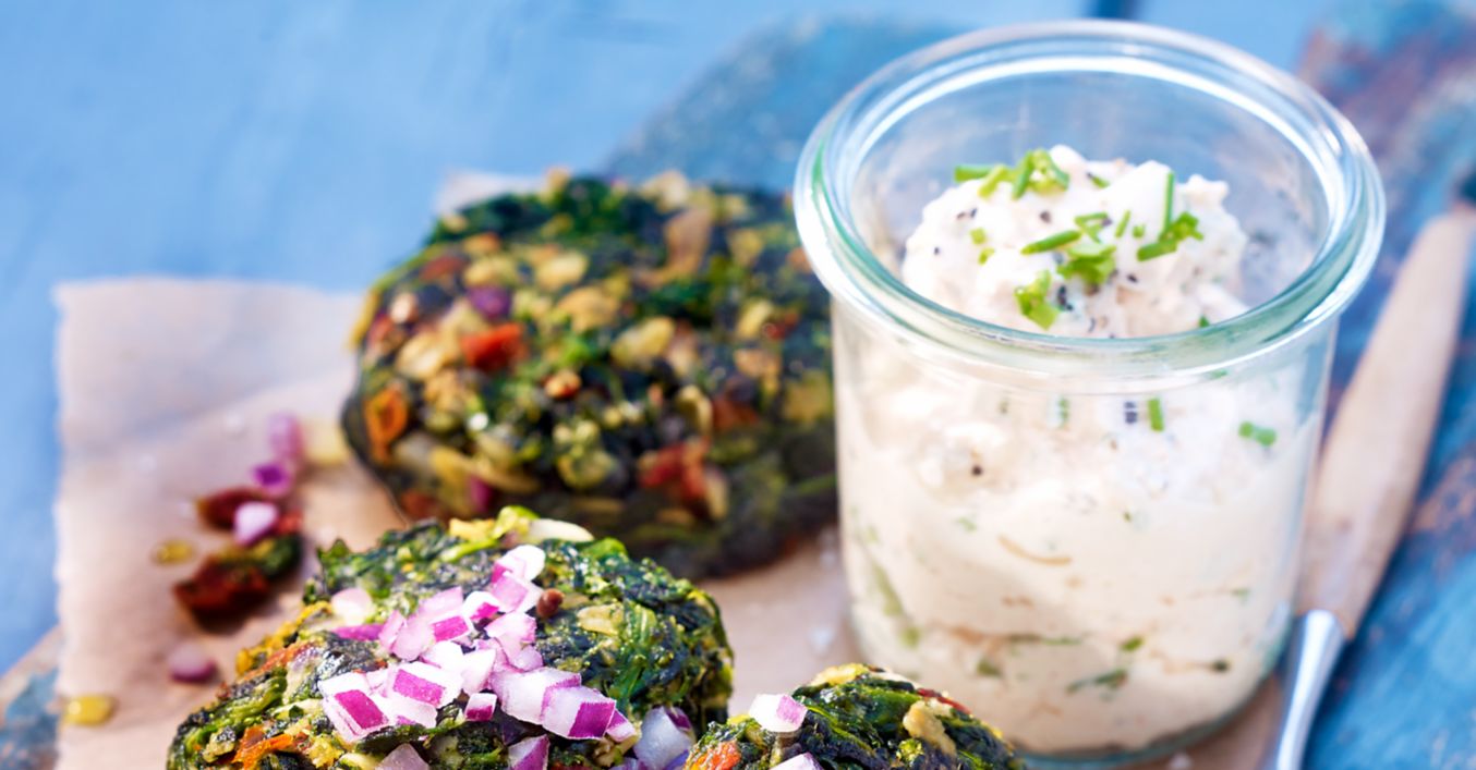 Bratlinge anrichten und nach Wunsch mit Zwiebelwürfeln betreuen. Dazu schmeckt ein Ricotta-Schnittlauch-Dip.