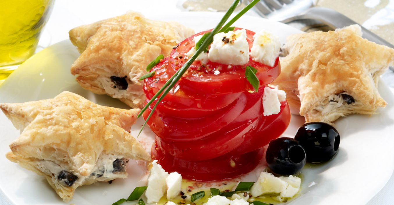 Tomatensalat anrichten und mit Blätterteigsternen servieren.