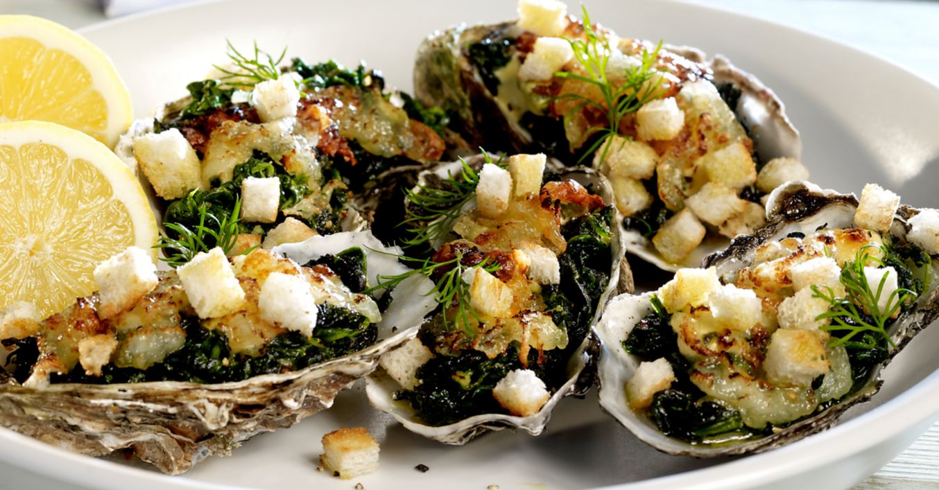 Fein gewürfelte Schalotte, zerdrückten Knoblauch und aufgetauten Spinat in 1 EL Butter andünsten. Crème fraîche untermischen, mit Salz, Pfeffer und Muskat abschmecken, auf den Austern verteilen.