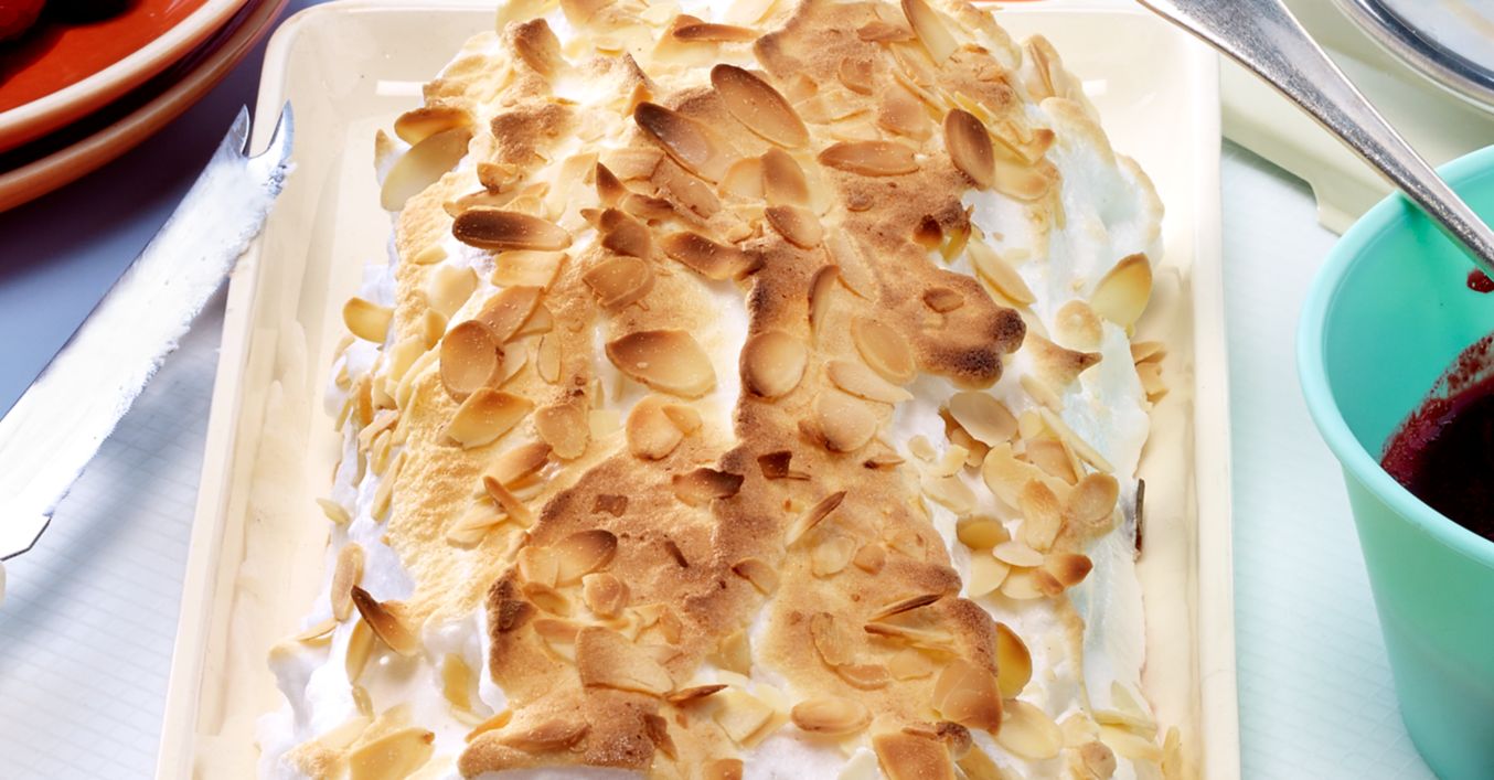 Das Eis auf ein mit Backpapier belegtes Backblech legen, mit Eischnee abdecken, Mandelblättchen überstreuen und im vorgeheizten Backofen bei 240 °C und Grillfunktion auf der obersten Schiene 1 bis 2 Minuten backen bis der Eischnee goldbraun ist.
