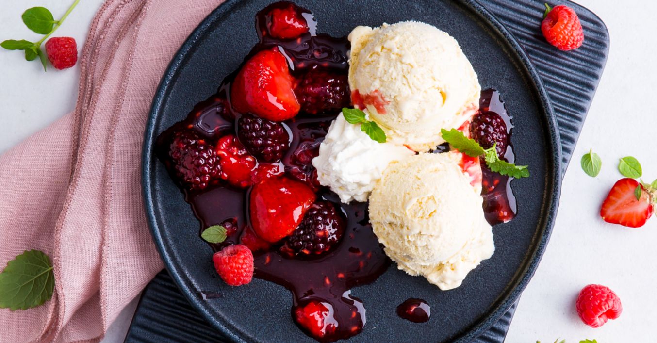 Eiskugeln in Dessertschalen füllen und mit Beerensoße und nach Wunsch mit Beeren und Minze garniert servieren.