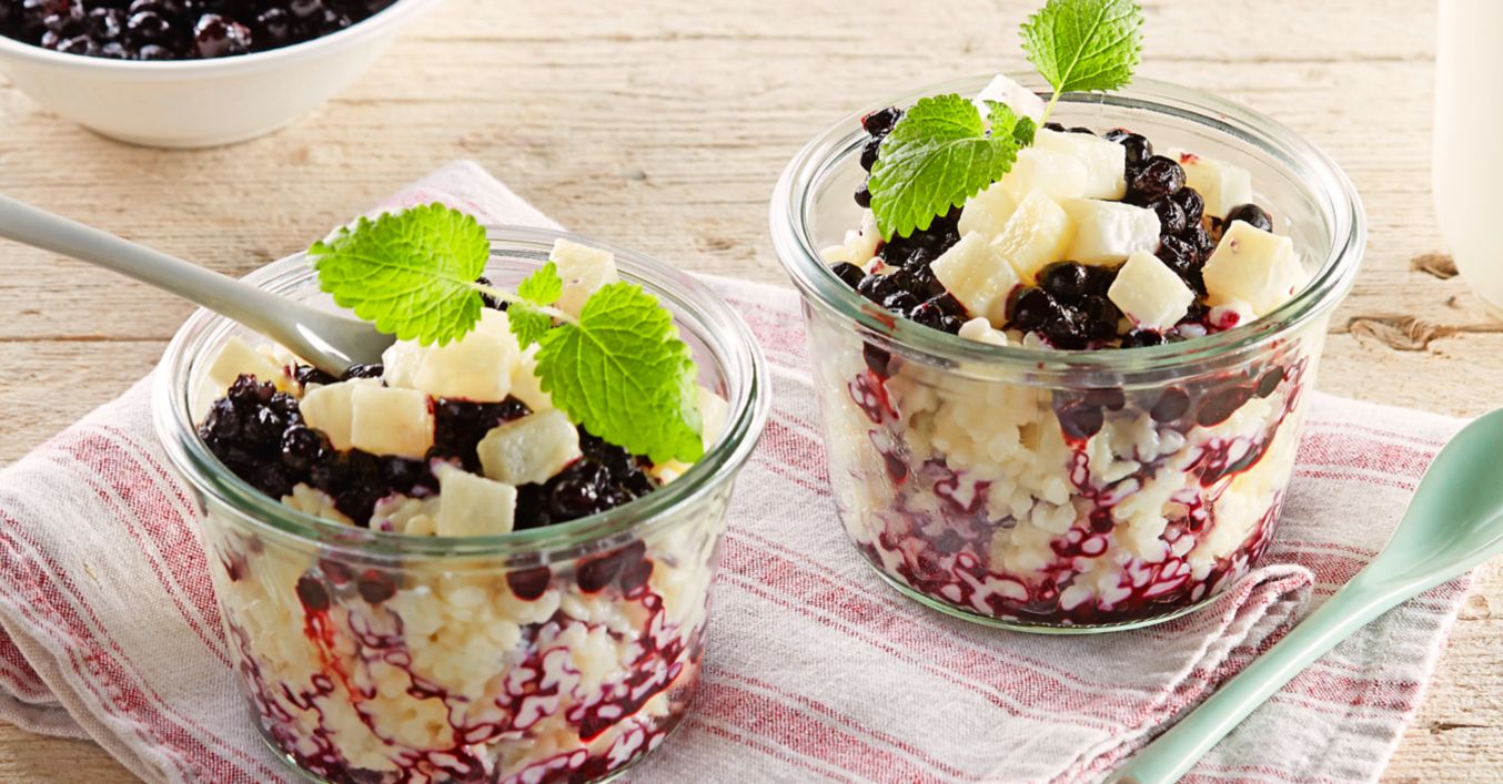Die Reismischung gleichmäßig auf vier mikrowellentaugliche Gläser (zum Beispiel kleine Einmachgläser oder spezielle mikrowellenfeste Gläser) verteilen, abdecken und miteinander nochmals 3 Minuten bei 600 Watt garen. Die abgetropften Blaubeeren auf dem Milchreis verteilen und mit den Birnenwürfeln und der Minze garnieren.
