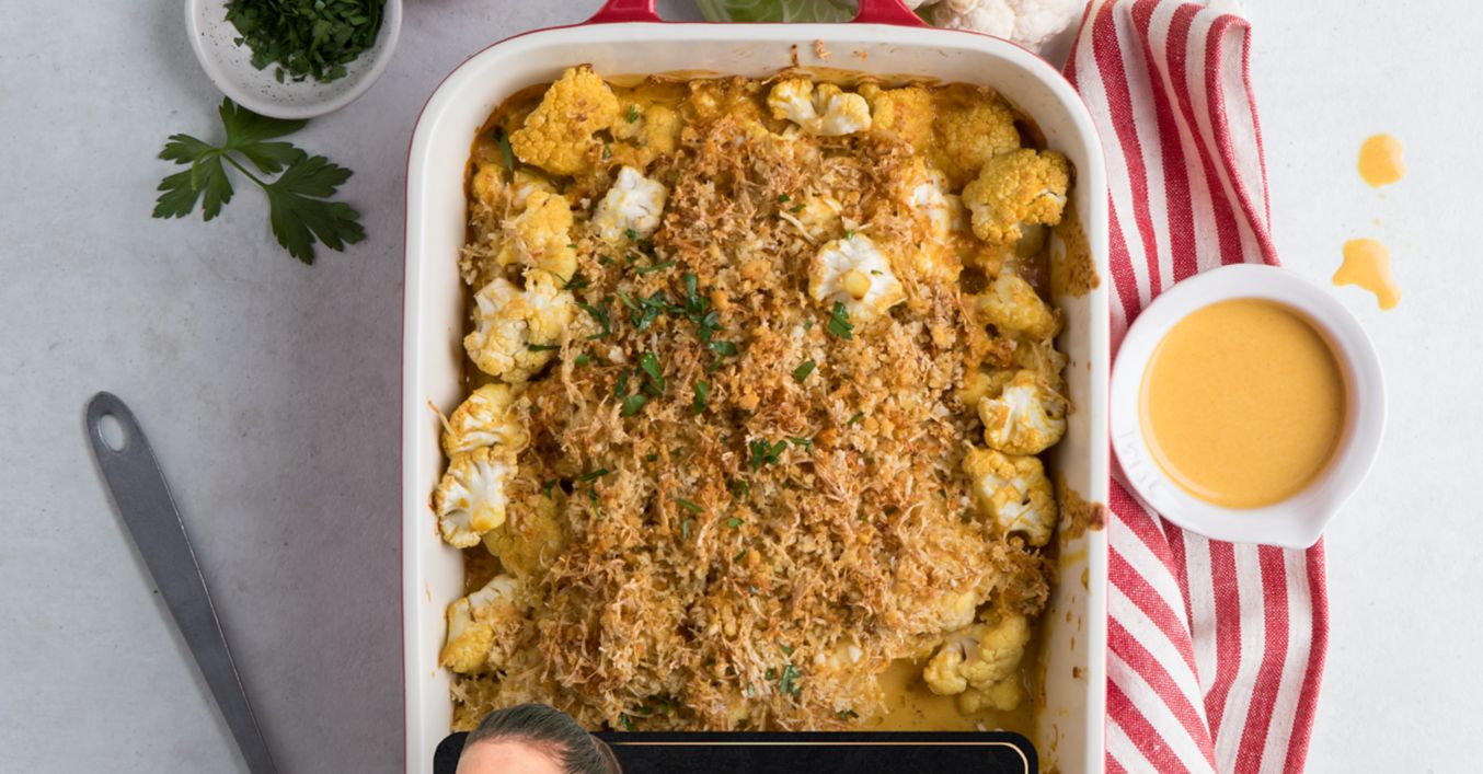 Die Mischung über den Blumenkohl verteilen und bei 200 °C Oberhitze 5 bis 10 Minuten goldbraun überbacken.